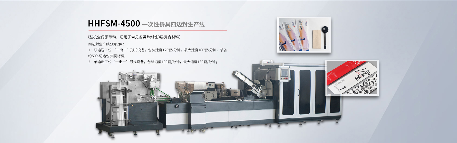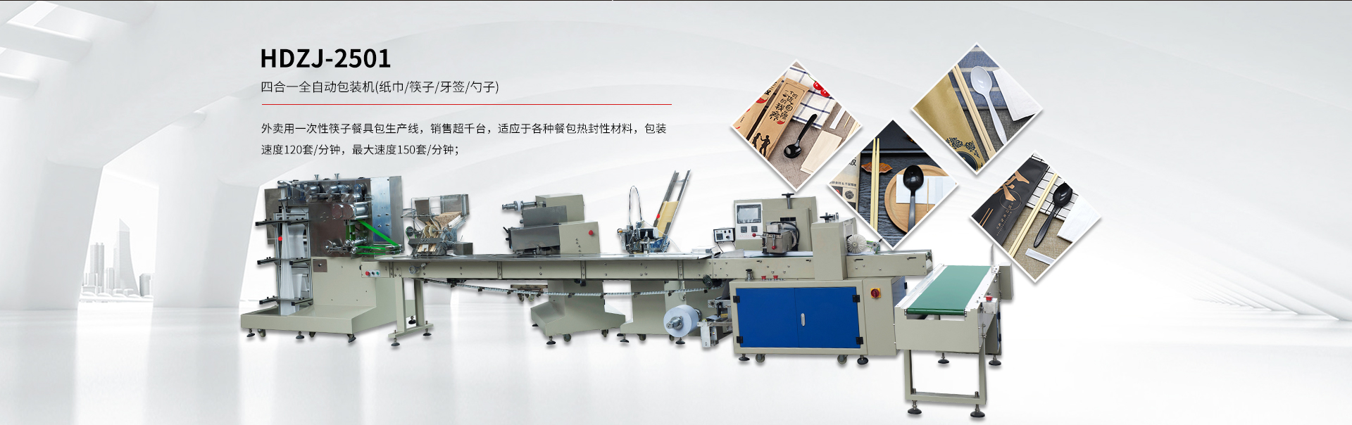 貴司專注于研發(fā)一次性紙巾筷子餐具包生產(chǎn)線、紙巾刀叉航空餐具包裝生產(chǎn)線、一次性餐具套裝四邊封生產(chǎn)線、塑料杯(碗)、吸管全自動點數(shù)自動包裝機及五金(塑料)制品包裝機等各類包裝機。